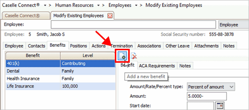 4. Use the Add Employee Benefit window to select a benefit and benefit level, and then click OK.
