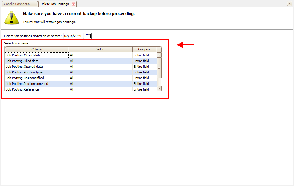 Job postings and applicant job postings with a close date that occurs on or before the date entered will be deleted when you run this view.