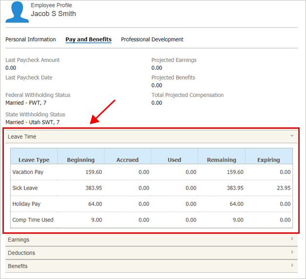 The Leave Time page shows all of the leave pay codes that are assigned to you.