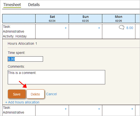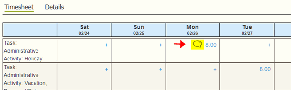 A comment bubble displays next to the hours recorded on My Timesheet. Clicking on the comment bubble will open the comment for viewing and editing.