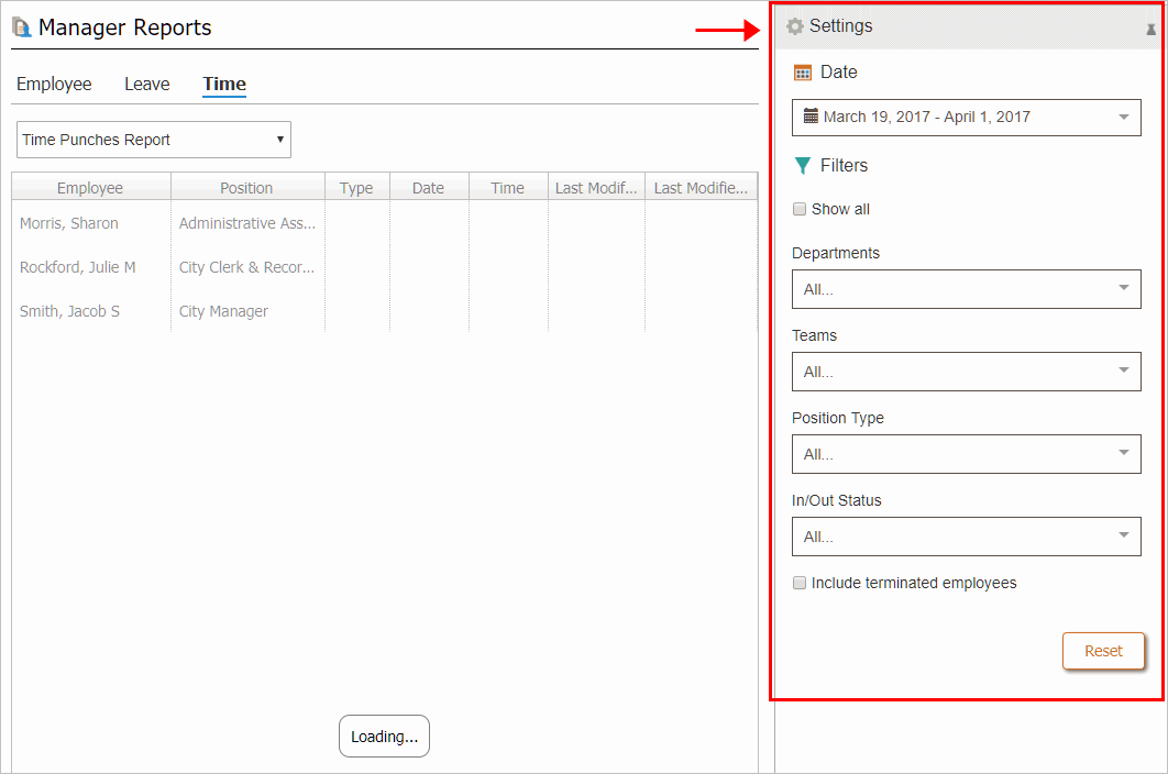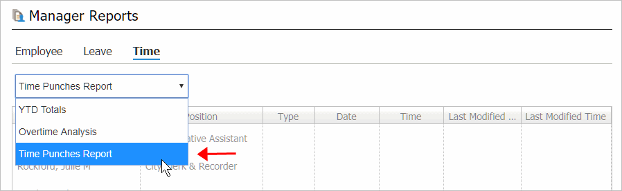 Generate the Employee Time Punches report to review the clock in and out times for employees in your department.