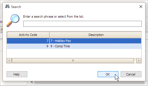 The Search form displays a list of activity codes for the selected activity. If the activity code is not assigned to the task, the activity code will not be included in the list.