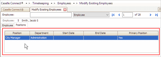 The grid on the Positions tab shows all of the positions linked to the employee.