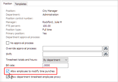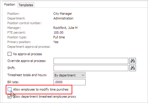 This help topic will change the time entry settings on a specific employee's position. If you'd like to change the time entry settings for the entire Timekeeping application, see the help topic titled How do I allow employees to change their time entries?
