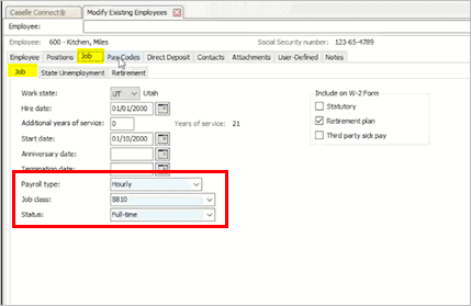 Payroll Modify Existing Employees > Job tab - Payroll type, Job class, Status