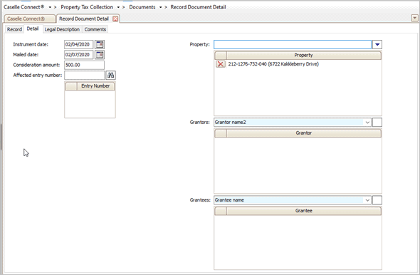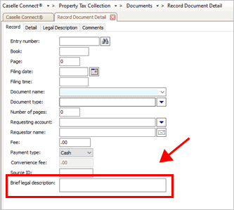 Use Record Document Detail to record a property's legal information, fees and payments, and grantors and grantees. The document details allow you to keep a document's entry number, book and page, filing date and time, document name and type, and so on. You can include the requesting account and name; associated fees, payment type, and payments; and a legal description of the property.