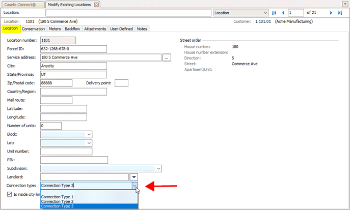 Assign the connection type a meter uses to connect to a service address. Some organizations use the connection type to print reports and track billing and usage. The connection type menu shows a list of user-defined values. You can add the connection types that you will need to track to the list. When you need to review usage or billing by connection type, you can print the Connection Type Report.