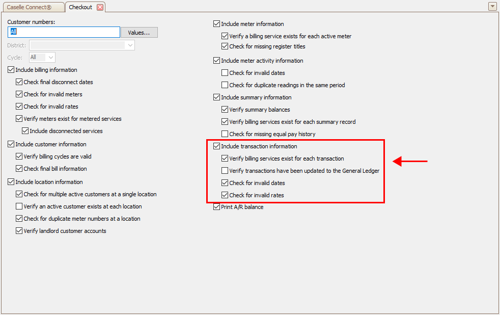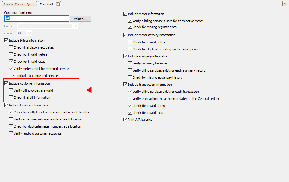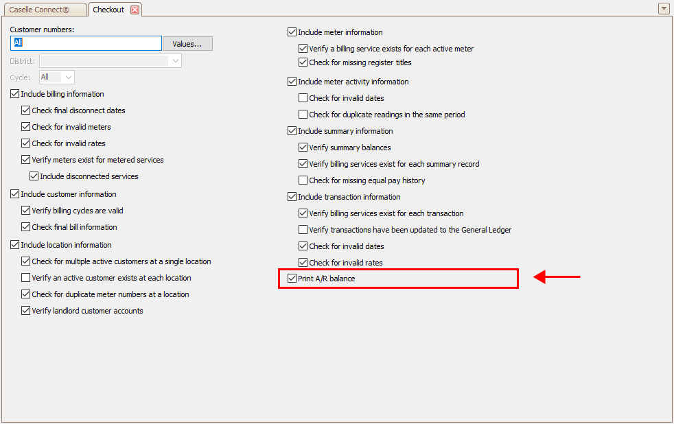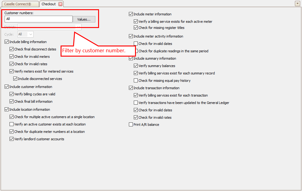 Use ALL to select all customers in the database. To run Checkout for a single customer number or a range of customer numbers, delete ALL and replace it with the customer number.