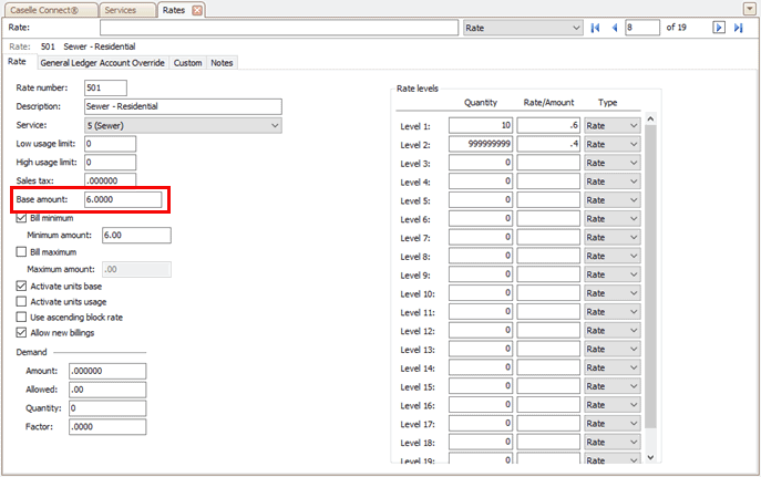 Example: City XYZ charges a base amount of $6 for sewer. The base amount may include waste treatment costs and/or a service charge for meter usage.
