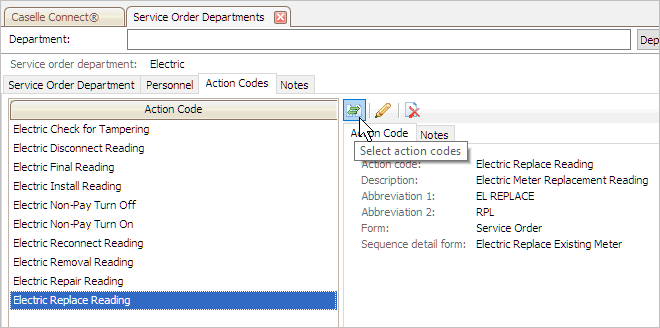 An Action Code is a description a user can assign to a transaction that occurs in the Utility Management program. If the Utility Management Service Orders interface is enabled, you can also use the action code to enter a service order. Use the options on the Action Codes tab to select the action codes to assign to the service orders created for the current department.