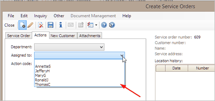 City XYZ has 121 employees. Of those 121 employees, five employees work with service orders. Instead of scrolling through 121 names to find the five employees who work on service orders, Jane decides to set up the Service Order Personnel list. She starts by adding the names of the five employees to Service Orders > Service Order Personnel. When she's finished, she opens Service Orders > Create Service Orders to check her work. When she clicks on the Assigned To drop-down list, only the names of the five employees appear in the drop-down list.