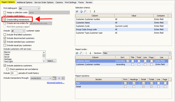 Can I save my options to bill penalty? Yes, you can but saving the report with the option to create billing transactions selected will bill penalty on all customers who are included on the report.